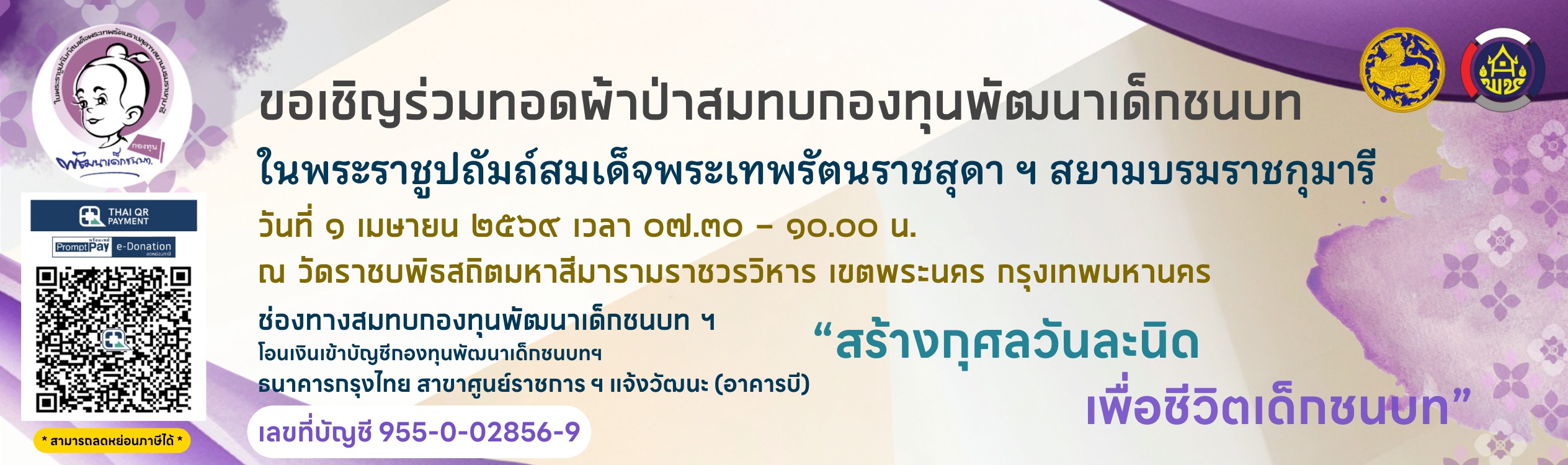 มาร่วมเป็นส่วนหนึ่งในการสร้างโอกาสและอนาคตที่ดีให้กับเด็กๆ ในพื้นที่ห่างไกล กับ 'กองทุนพัฒนาเด็กชนบท ในพระราชูปถัมภ์ สมเด็จพระเทพรัตนราชสุดาฯ สยามบรมราชกุมารี' เพียงร่วมบริจาคสมทบทุน..