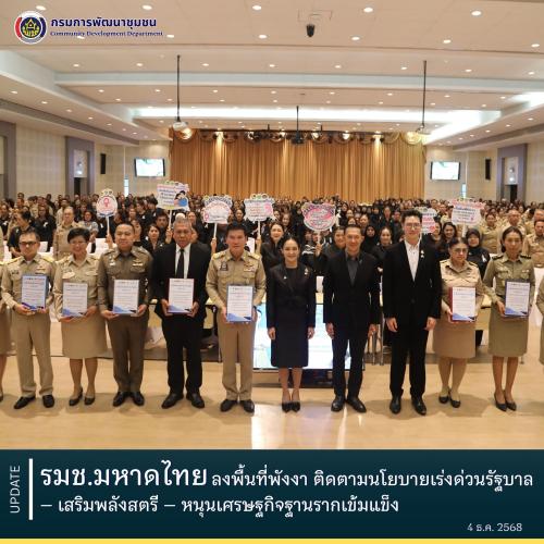เวลา 13.00–14.30 น. ณ ห้องประชุมภูผา ศาลากลางจังหวัดพังงา รัฐมนตรีช่วยว่าการฯ ได้ติดตามผลการดำเนินงานของจังหวัดในประเด็นสำคัญ อาทิ การขยายผล “คนละครึ่ง พลัส” เพื่อเพิ่มรายได้ให้ประชาชนและผู้ประกอบการรายย่อย การส่งเสริมท่องเที่ยวชุมชน การเร่งรัดการเบิกจ่ายงบประมาณ การเตรียมความพร้อมด้านป้องกันและบรรเทาสาธารณภัย และการจัดทำคำของบประมาณปี 2570 ให้สอดคล้องกับนโยบายรัฐบาล โดยมี ว่าที่ร้อยตรีตระกูล โทธรรม ผู้ตรวจราชการกระทรวงมหาดไทย, นายสงัด พืชพันธุ์ หัวหน้าผู้ตรวจราชการกรม, และคณะข้าราชการกรมการพัฒนาชุมชน ร่วมสนับสนุนภารกิจอย่างใกล้ชิด