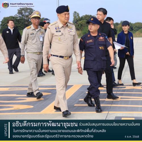 ในโอกาสนี้ นายสยาม ศิริมงคล อธิบดีกรมการพัฒนาชุมชน พร้อมด้วยนางอรุณรัตน์ ชิงชนะ ผู้ตรวจราชการกรมการพัฒนาชุมชน ปฎิบัติหน้าที่ผู้อำนวยการศูนย์ศึกษาและพัฒนาชุมชนนครราชสีมา นางรัชนี สาระวิถีพัฒนาการจังหวัดบุรีรัมย์ และทีมข้าราชการ และเจ้าหน้าที่กรมการพัฒนาชุมชนในระดับพื้นที่ ร่วมต้อนรับนายกรัฐมนตรีฯ ร่วมรับฟังนโยบาย และสนับสนุนการดำเนินงานร่วมกับหน่วยงานด้านความมั่นคง โดยกรมการพัฒนาชุมชนมีบทบาทสำคัญในการประสานงานระดับพื้นที่ ผ่านเครือข่ายผู้นำชุมชนและโครงสร้างการพัฒนาหมู่บ้าน เพื่อร่วมเสริมสร้างความเข้มแข็งของพื้นที่ส่วนหลังและการดูแลประชาชนเมื่อเกิดเหตุฉุกเฉิน