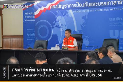 วันที่ 14 ธันวาคม 2568 เวลา 10.00 น. นายสามารถ สุวรรณมณี รองอธิบดีกรมการพัฒนาชุมชน ได้เข้าร่วมการประชุมกองบัญชาการป้องกันและบรรเทาสาธารณภัยแห่งชาติ (กบปภ.ช.) ครั้งที่ 8/2568 ณ ห้องประชุม 1 อาคาร 3 ชั้น 5 กรมป้องกันและบรรเทาสาธารณภัย และผ่านระบบสื่ออิเล็กทรอนิกส์ โดยมีหน่วยงานที่เกี่ยวข้องเข้าร่วมประชุมอย่างพร้อมเพรียง