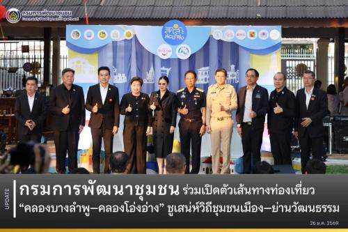วันที่ 26 มกราคม 2569 ณ พิพิธบางลำพู กรุงเทพมหานคร นายสยาม ศิริมงคล อธิบดีกรมการพัฒนาชุมชน ร่วมงานแถลงข่าวเปิดตัวเส้นทางท่องเที่ยวปฐมฤกษ์คลองบางลำพู-คลองโอ่งอ่าง ซึ่งจัดขึ้นโดยความร่วมมือระหว่างการท่องเที่ยวแห่งประเทศไทย (ททท.) สำนักงานเขตพระนคร และสำนักงานส่งเสริมเศรษฐกิจสร้างสรรค์ โดยมีนางสาวฐาปนีย์ เกียรติไพบูลย์ ผู้ว่าการท่องเที่ยวแห่งประเทศไทย (ททท.) กล่าวเปิดตัวเส้นทางท่องเที่ยวฯ พร้อมมีหัวหน้าส่วนราชการ และประชาชน เข้าร่วมเป็นเกียรติอย่างพร้อมเพรียงกัน
