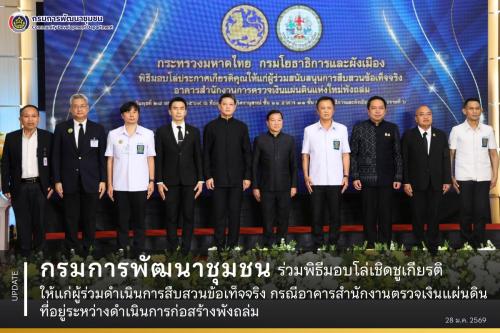 วันที่ 28 มกราคม 2569 เวลา 09.30 น. ณ กรมโยธาธิการและผังเมือง นายสยาม ศิริมงคล อธิบดีกรมการพัฒนาชุมชน เข้าร่วมพิธีมอบโล่เชิดชูเกียรติให้แก่ผู้ร่วมดำเนินการสืบสวนข้อเท็จจริง กรณีอาคารสำนักงานตรวจเงินแผ่นดินที่อยู่ระหว่างดำเนินการก่อสร้างพังถล่ม โดยมีนายอรรษิษฐ์ สัมพันธรัตน์ ปลัดกระทรวงมหาดไทย ให้เกียรติเป็นประธานในพิธี พร้อมมีนายพงษ์นรา เย็นยิ่ง อธิบดีกรมโยธาธิการและผังเมือง หัวหน้าส่วนราชการ และเจ้าหน้าที่เข้าร่วมเป็นเกียรติโดยพร้อมเพรียงกัน