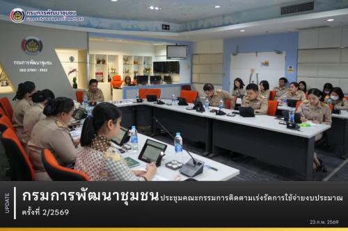 วันที่ 23 กุมภาพันธ์ 2569 เวลา 13.30 น. ณ ห้องประชุม War room ชั้น 5 กรมการพัฒนาชุมชน และผ่านระบบวีดิทัศน์ทางไกล (Video Conference) นายสามารถ สุวรรณมณี รองอธิบดีกรมการพัฒนาชุมชน เป็นประธานการประชุมคณะกรรมการติดตามเร่งรัดการใช้จ่ายงบประมาณรายจ่ายประจำปีงบประมาณ พ.ศ. 2569 ของกรมการพัฒนาชุมชน ครั้งที่ 2/2569 โดยมีผู้บริหารกรมการพัฒนาชุมชน และเจ้าหน้าที่ที่เกี่ยวข้องเข้าร่วมประชุม เพื่อติดตามผลการดำเนินงานและเร่งรัดการใช้จ่ายงบประมาณให้เป็นไปตามเป้าหมายของรัฐบาล