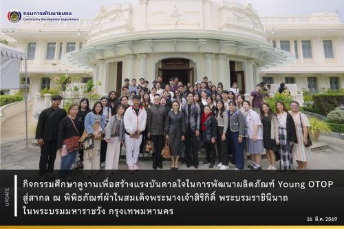 วันที่ 16 มีนาคม 2569 กรมการพัฒนาชุมชน ได้จัดกิจกรรม ศึกษาดูงานด้านการสืบสาน รักษา และต่อยอดภูมิปัญญาผ้าไทยและงานหัตถกรรม ภายใต้โครงการพัฒนาต่อยอดภูมิปัญญาผลิตภัณฑ์ Young OTOP สู่สากล ณ พิพิธภัณฑ์ผ้าในสมเด็จพระนางเจ้าสิริกิติ์ พระบรมราชินีนาถ ในพระบรมมหาราชวัง กรุงเทพมหานคร โดยมี ผู้ประกอบการ Young OTOP ที่เข้าร่วมโครงการ จำนวน 57 ราย เข้าร่วมเดินทางไปศึกษาดูงาน เพื่อเรียนรู้แนวคิดการอนุรักษ์และต่อยอดภูมิปัญญาผ้าไทย รวมถึงการพัฒนาผลิตภัณฑ์ให้มีความร่วมสมัยและสามารถแข่งขันในตลาดสากลได้